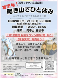 12月20日(土)・21日(日)・22日(月)に松阪マラソンの応援企画として【岡寺山でひと休み】を開催します。